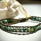 Odkryj subtelny luksus ręcznie tkanej bransoletki, która harmonijnie łączy naturalne zielone kamienie o średnicy 4 mm z afrykańskim drewnem sosnowym. Każdy egzemplarz jest starannie wykonany ręcznie, dzięki czemu biżuteria emanuje autentycznym charakterem i niepowtarzalnym stylem.