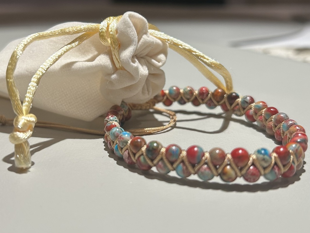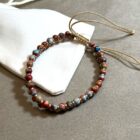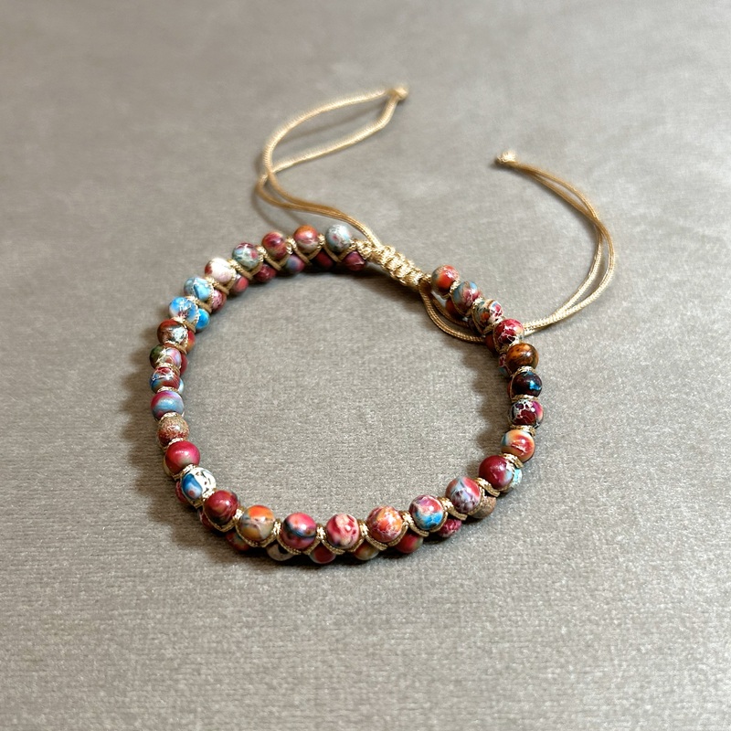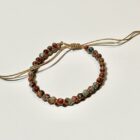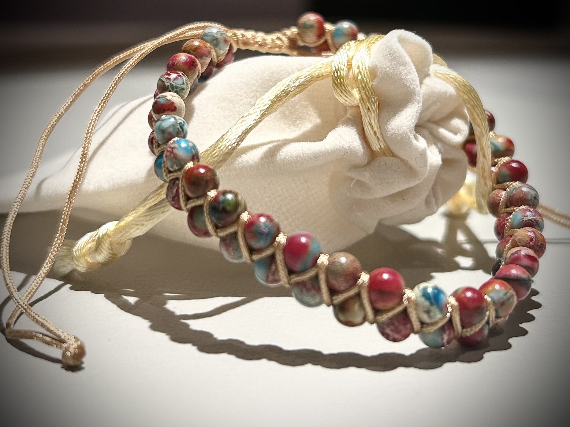 Wyjątkowa, ręcznie pleciona bransoletka, która łączy w sobie swobodę boho z delikatną elegancją. Naturalny kamień cesarski w ciepłym, naturalnym odcieniu zestawiono z błękitem akwamarynu — barwy przypominającej spokojne morskie fale. Taka kolorystyka sprawia, że biżuteria skutecznie ożywia stylizacje, nie przytłaczając ich, i pozostaje niezwykle uniwersalna przez cały rok.